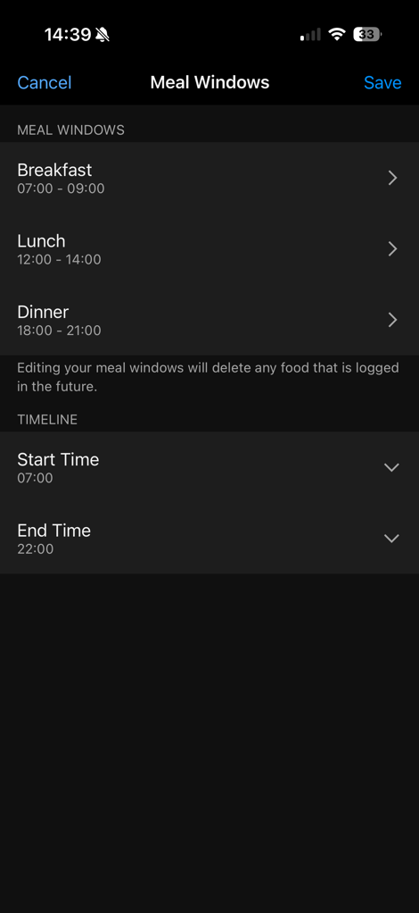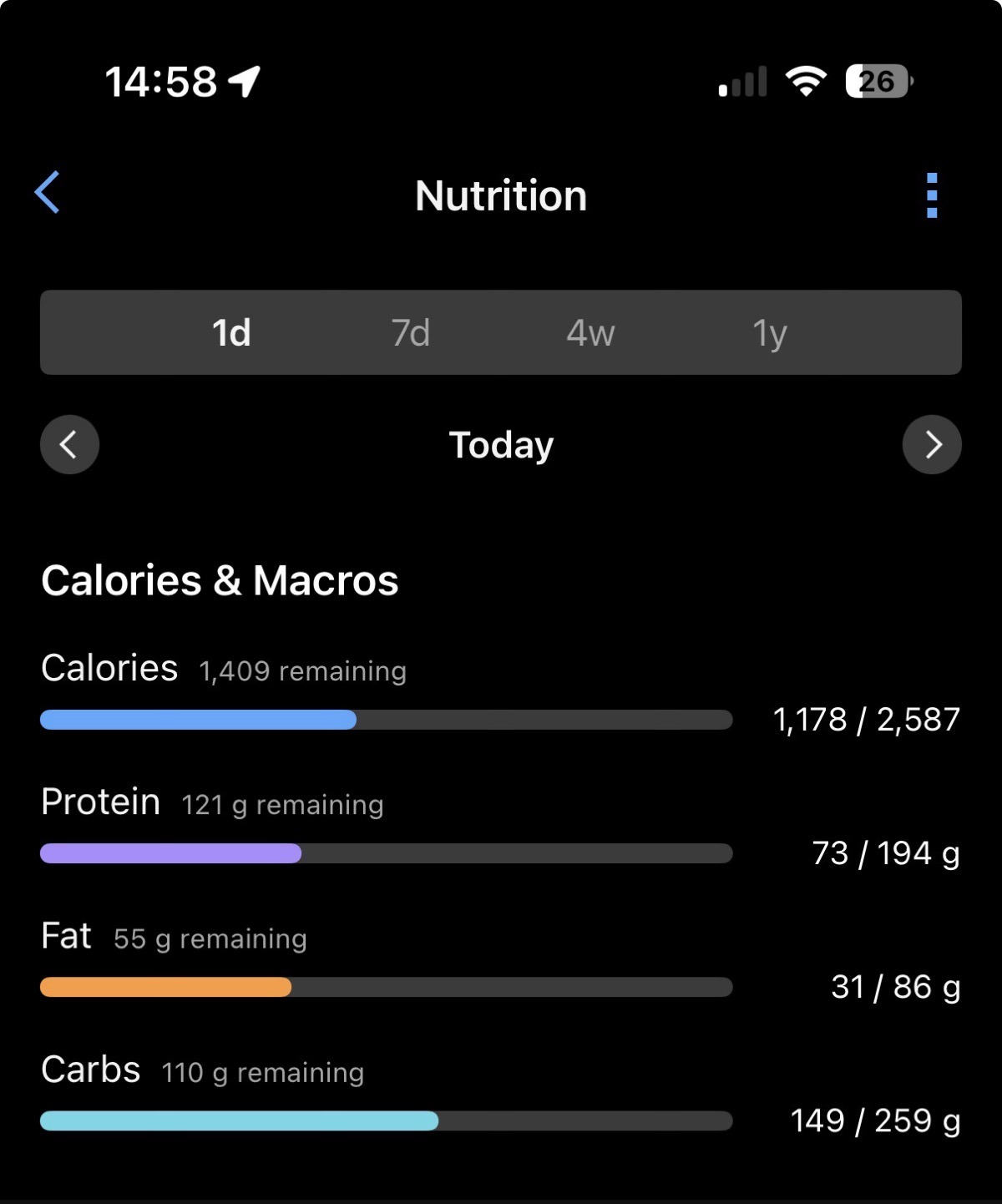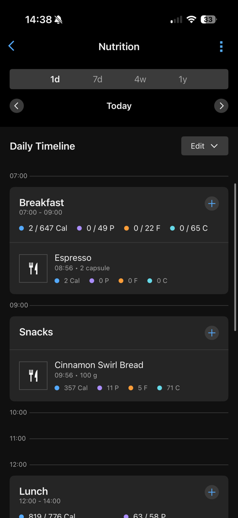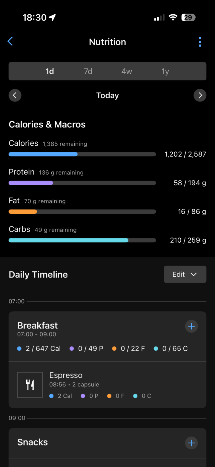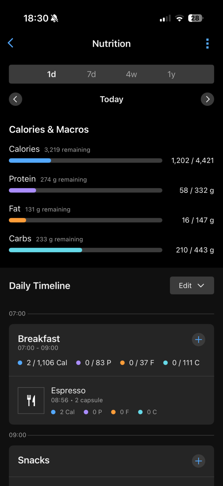 Once opened up, you’ll see your live Calories & Macros at the top (also note the 1-day/7-day/4-week/1-year options), and then below that a daily timeline that’s divided up into Breakfast, Lunch, Dinner, with the hours of the day as well.