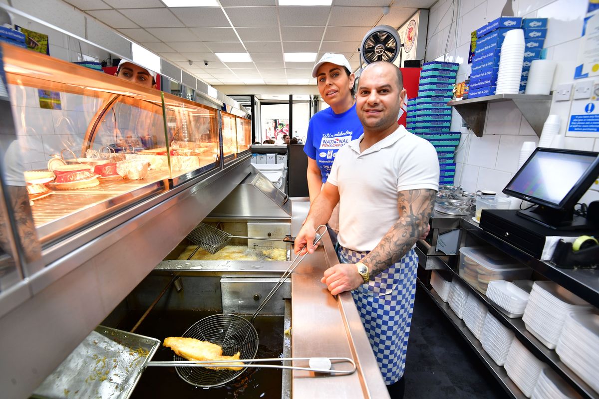 Yanni and Sandra Lawton from Yanni’s Traditional Fish & Chips on Lord Street, Liverpool. Photo by Colin Lane