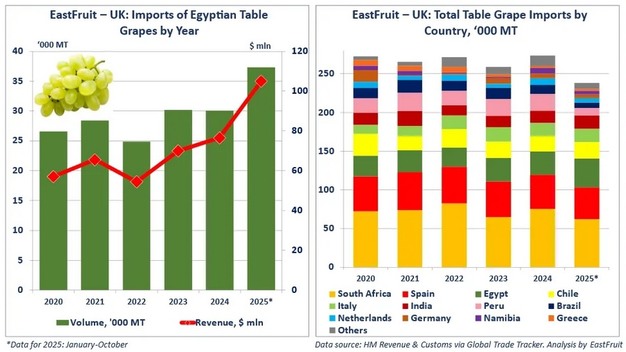 During the first 10 months of the year, the United Kingdom imported 37.3 thousand tons of Egyptian table grapes with a total value of more than US$105 million. This volume was 24% higher than the results recorded in both 2023 and 2024, establishing a new peak for Egyptian grape shipments to the UK market.