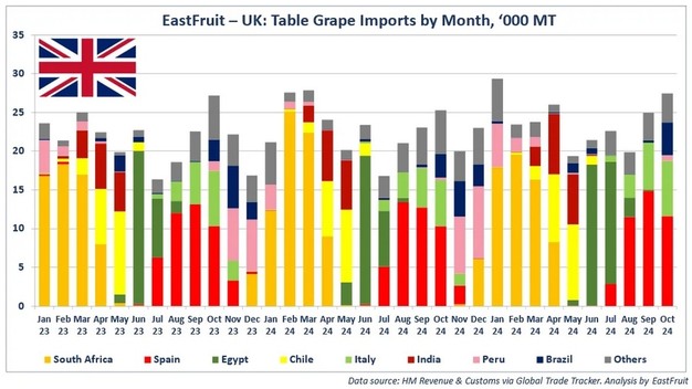The UK grape market operates on a year-round import basis, with monthly volumes typically ranging between 16 and 30 thousand tons. Supply sources shift throughout the year. South Africa dominates shipments from January to March, followed by India and Chile in April and May. June is traditionally the peak month for Egyptian grapes, when their market share exceeds 80%. In July, Spain and Italy usually enter the market alongside Egypt, while from August to October, European supplies take the lead. Imports in November and December are largely sourced from Peru and Brazil.