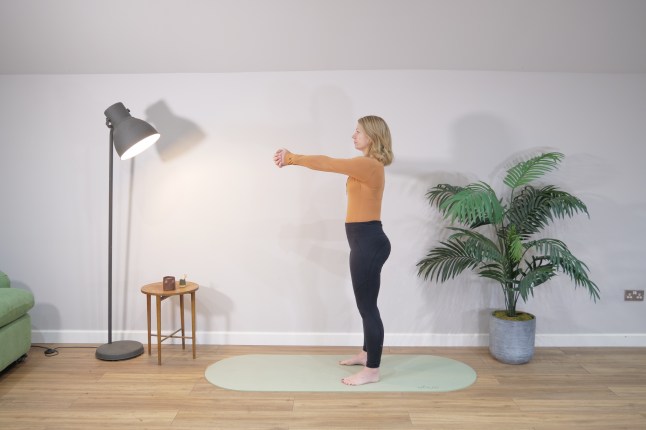 How to do it: Stand tall with your feet hip-width apart. Clasp your hands together in front of your chest. Extend your arms straight out in front of you and hold. Stay tall through the spine, ribs stacked over pelvis, and breathe normally. To make it harder, slowly move the arms a few centimetres side to side without letting your torso twist.
