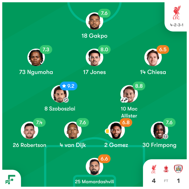 According to FotMob, Szoboszlai was also Liverpool’s standout figure statistics-wise, earning a 9.2 and making the most defensive contributions (eight).