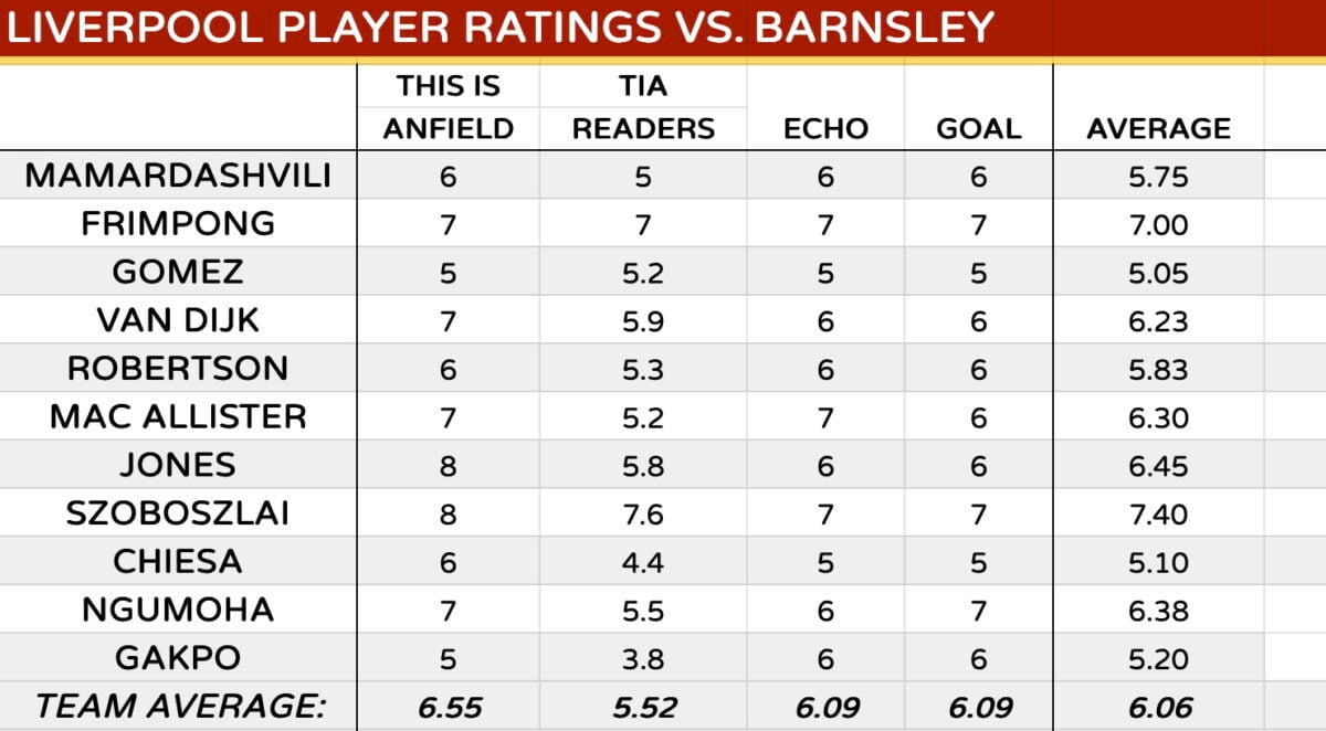 Jeremie Frimpong (7.00) was the only other player to average a seven-out-of-10 score or above, showing that it wasn’t a classic Liverpool performance.