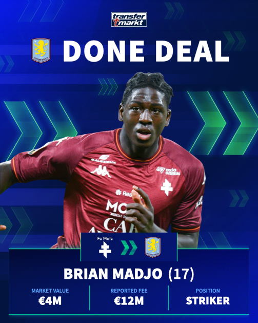 Aston Villa have won the race for Metz sensation Brian Madjo. The 17-year-old will has joined Unai Emery’s side for a deal worth around €12 million deal. Several leading European giants have chased Madjo’s signature but Villa have completed the deal and it must be viewed as a major coup. Madjo has sign eda five-and-and-a-half year deal with the Midlands club and he’s one of the most expensive 17-year-olds in history.