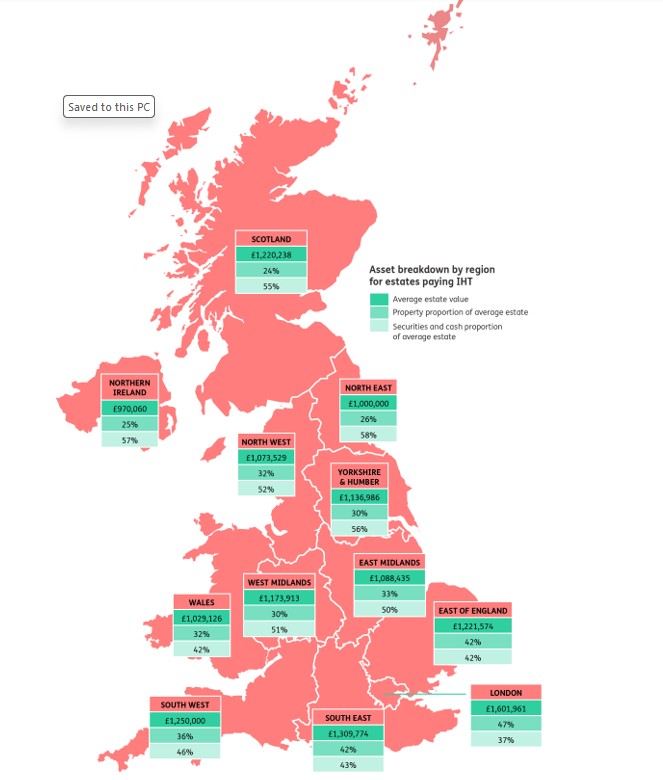 Property wealth makes up around a quarter of the value of the average IHT-paying estate in Scotland (24%), Northern Ireland (25%) and the North East (26%).