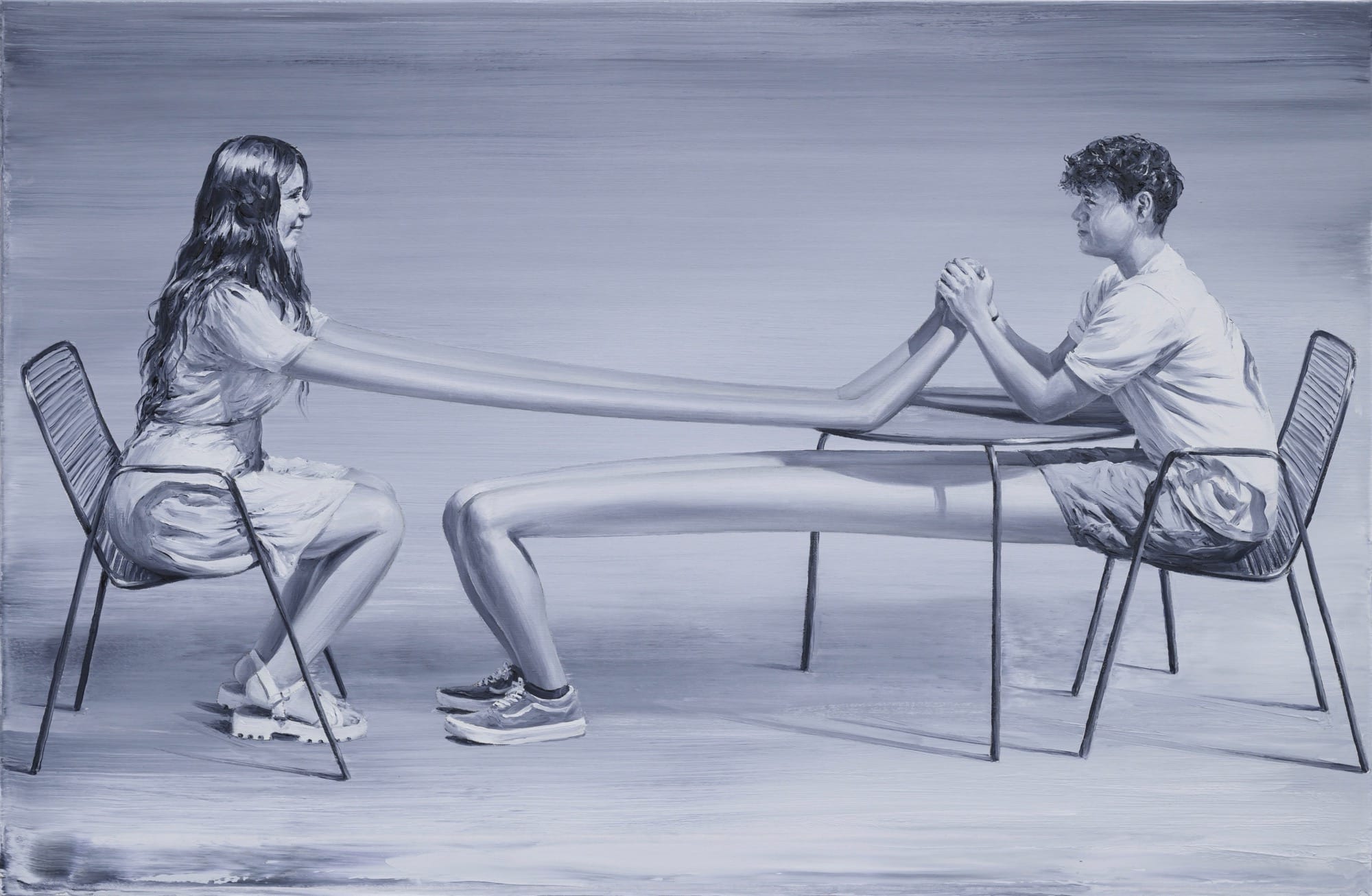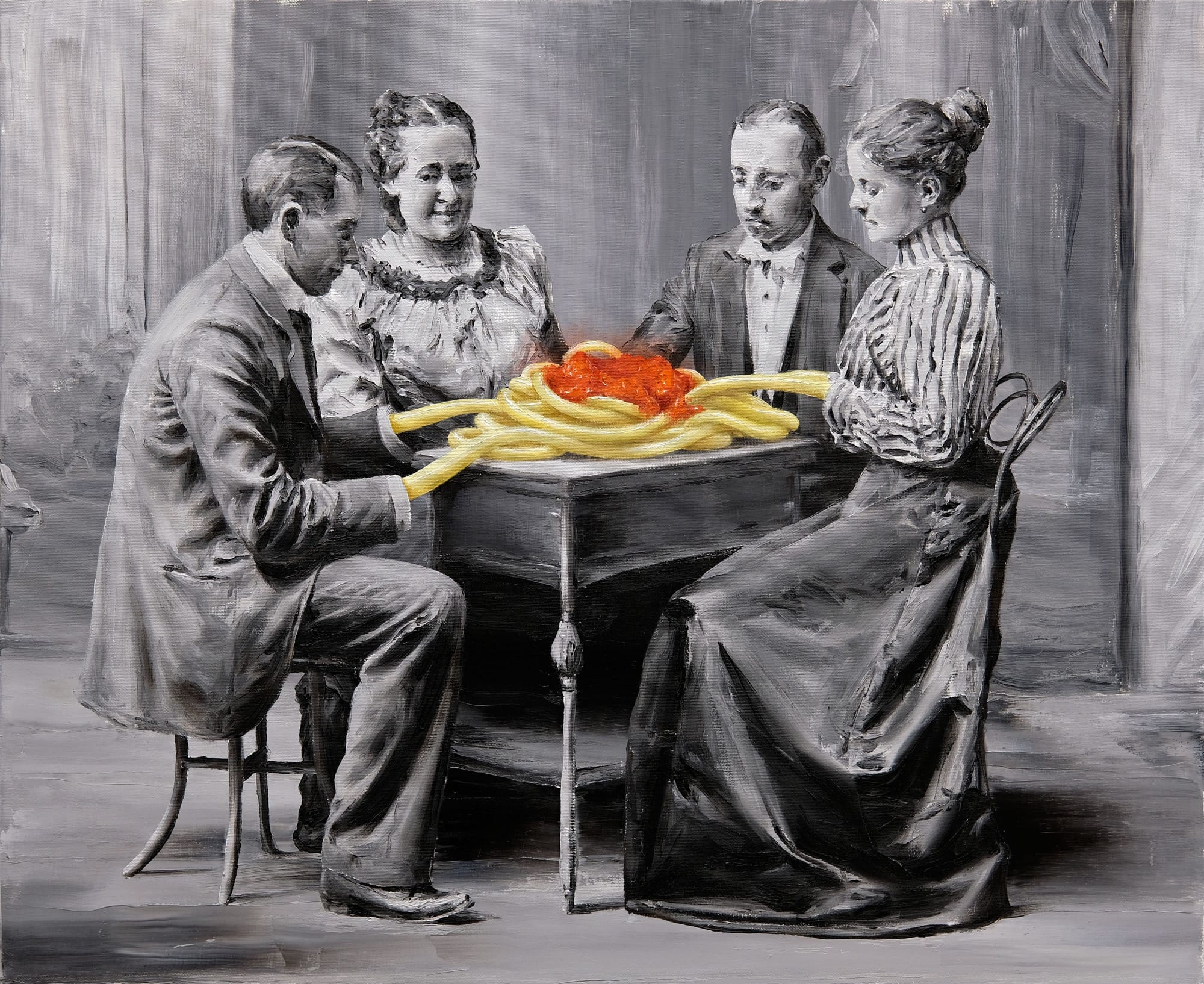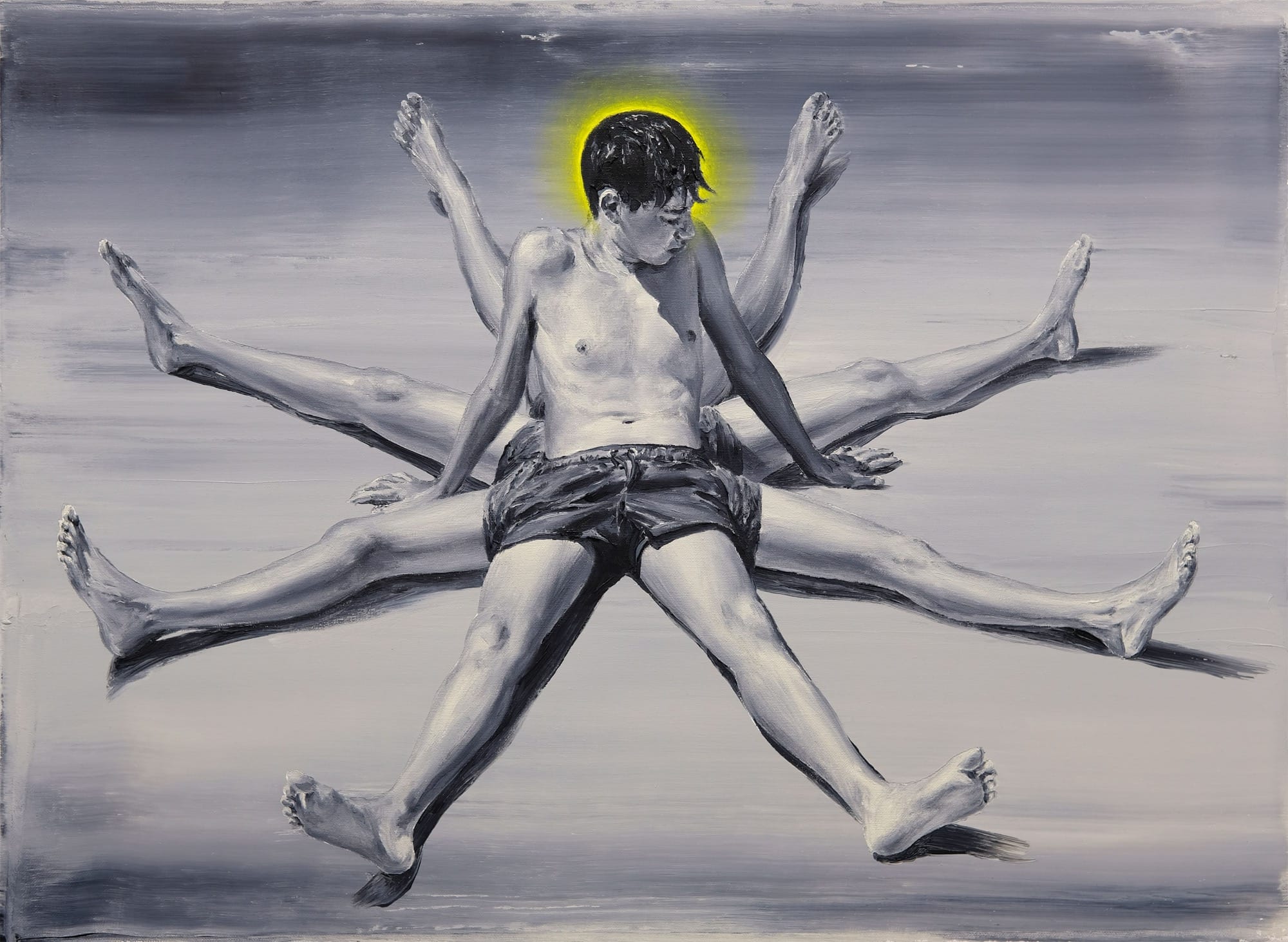 From figures with multiple legs and noodles for arms to frolicking trees, Paco Pomet summons the absurd. Known for his uncanny oil paintings rendered mostly in monochrome and enlivened by colorful details of overly stretchy limbs or celestial objects, a sense of nostalgia greets surreal scenarios. The artist often derives his imagery from vintage black-and-white photographs, adding an absurd dimension to history.