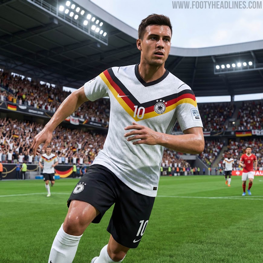 - Home and Away Kit Concepts: The home kit concept is white with a black-red-yellow chevron and a DFB icon print, while the away kit concept is black with golden logos and the German flag colors on the collar and cuffs.