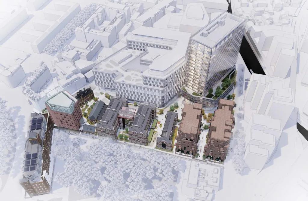 The previous proposals for the St Pancras hospital site, which went out to consultation in 2023. The Architecture 00 office tower is pictured top right, with the Peter Barber Architects’ housing block below