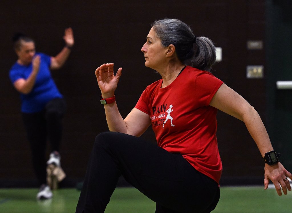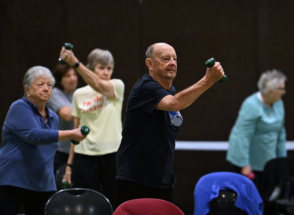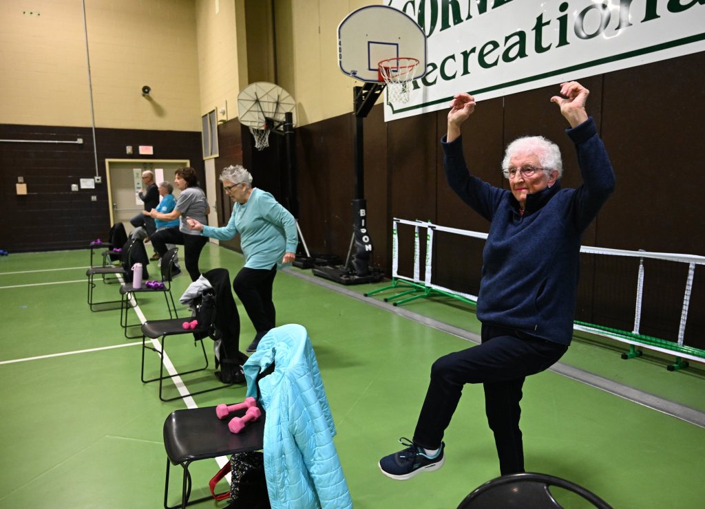 Petruccelli doesn’t always point it out, but many of the moves are designed to mimic what members of the class might do in their daily life, like reaching for something in a cupboard, unloading the dishwasher or stepping over a pet on the floor. She demonstrated an exercise Monday, lifting her leg in front of her and reaching her arms to her foot, like you’re tying your shoe, she said. A man quipped back that he wears slip-ons, drawing laughs from the rest of the class.