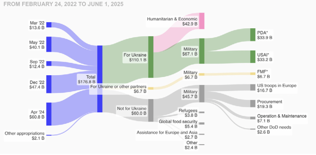 In 2022–24, the US allocated $175.1 bn in additional funding in response to Russia’s full-scale invasion through five Ukraine Supplemental Appropriations Acts. In 2025, no additional funding of this kind was allocated.