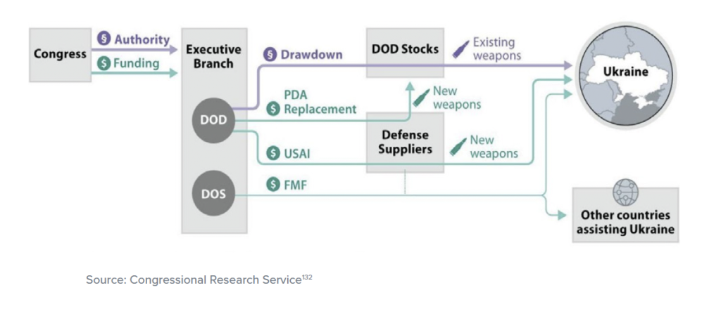 - Common challenges across the US and the European Union (EU) in terms of transferring materiel from existing stocks are as follows: shrinking aid packages, slow replenishment of partners’ depleted stocks, politically driven bans on supplying particular types of weapons, vetoes on funds disbursement, expiration of authorities, and counting errors.