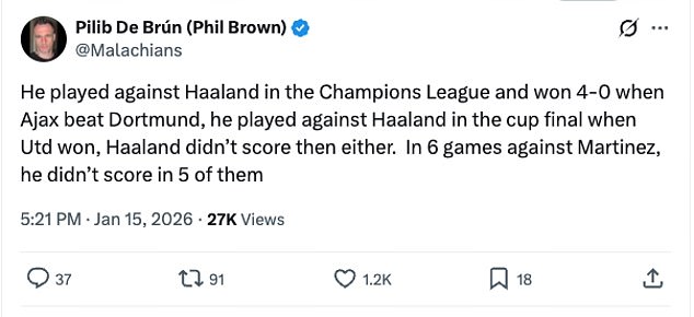 Another person posted on X: ‘He (Martinez) played against Haaland in the Champions League and won 4-0 when Ajax beat Dortmund, (sic) he played against Haaland in the cup final when Utd won, Haaland didn’t score then either. In 6 games against Martinez, he didn’t score in 5 of them.’