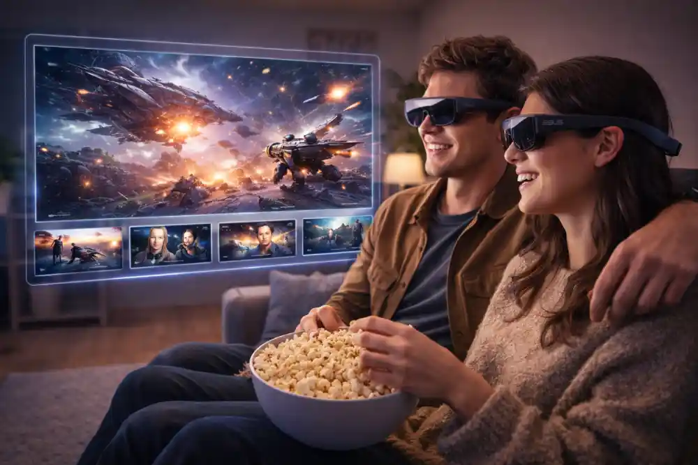 The ROG Xreal R1 also points to how lightweight display glasses may be used beyond individual gaming sessions. Because the glasses present standard flat video content rather than immersive virtual environments, the same material can be viewed simultaneously by multiple users wearing their own devices. This makes scenarios such as shared movie viewing or group presentations technically straightforward, provided each user has a connected source.