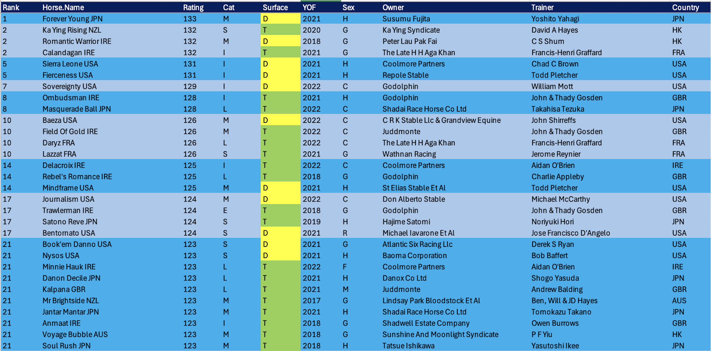 You may note that Ka Ying Rising, Romantic Warrior and Calandagan share a three-way tie with a best of TRC132. The sprinter hit this mark on no fewer than three occasions in the calendar year; for good measure, he was also named Timeform Horse of the Year for 2025, while he topped worldwide rankings according to the highly respected Racing Post team.