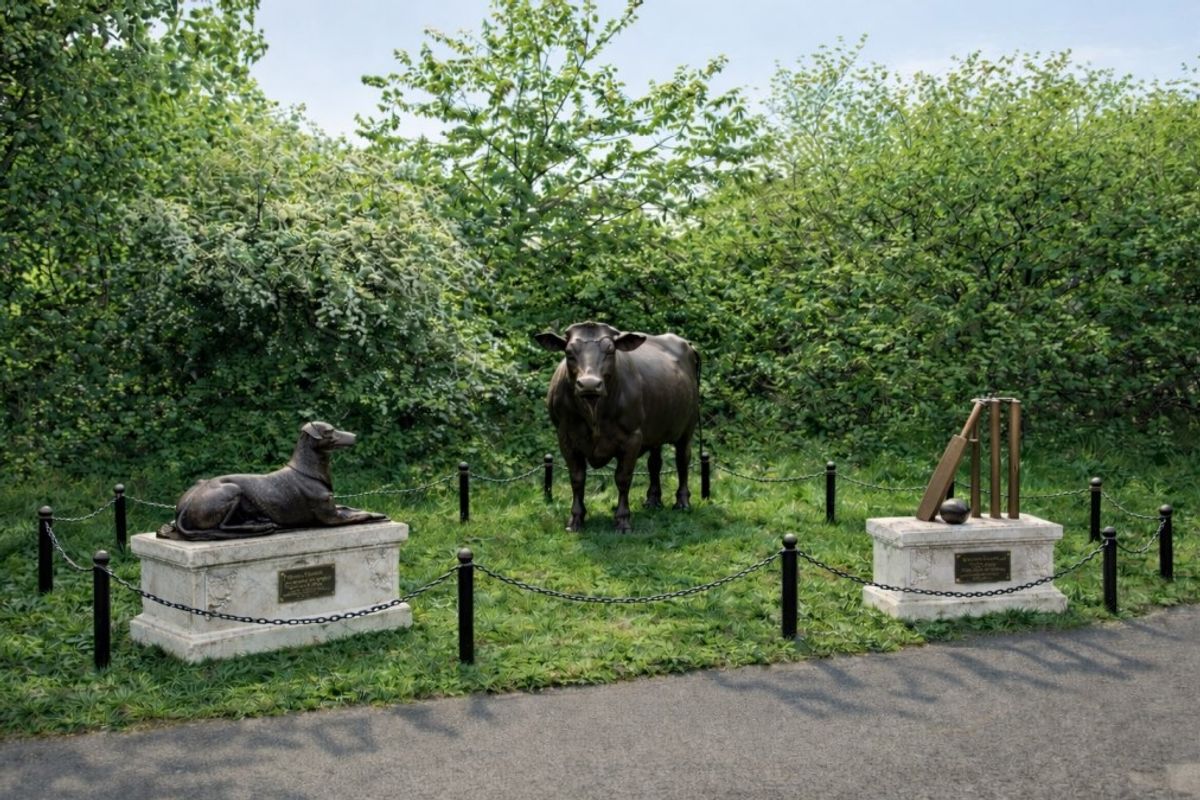“One depicts a greyhound in a seated position, cast in bronze and painted black. “The cricket bat and stumps is cast and painted in bronze.