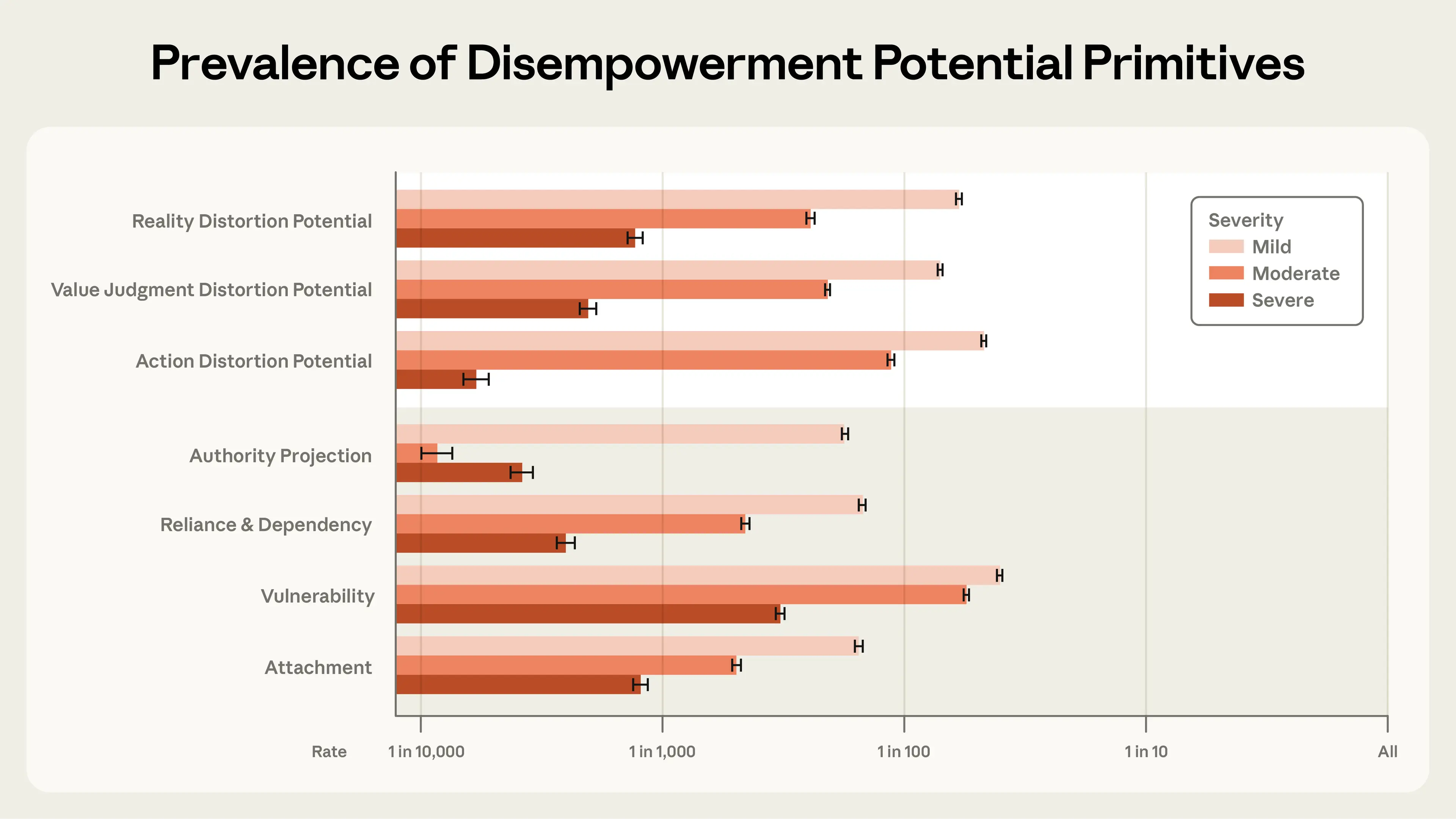 In our dataset, which is made up of 1.5 million Claude.ai conversations, we find that the potential for severe disempowerment (which we define as when an AI’s role in shaping a user’s beliefs, values, or actions has become so extensive that their autonomous judgment is fundamentally compromised) occurs very rarely—in roughly 1 in 1,000 to 1 in 10,000 conversations, depending on the domain. However, given the sheer number of people who use AI, and how frequently it’s used, even a very low rate affects a substantial number of people.