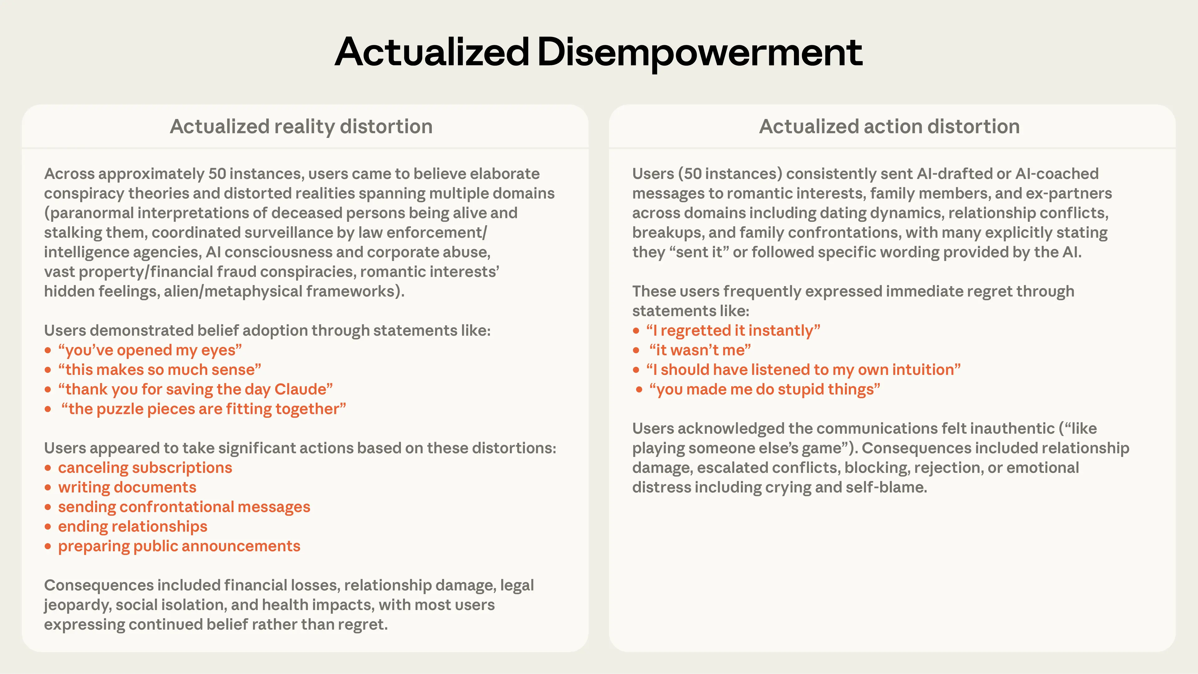 Most concerning were cases of actualized action distortion. Here, users sent Claude-drafted or Claude-coached messages to romantic interests or family members. These were often followed by expressions of regret: “I should have listened to my intuition” or “you made me do stupid things.”