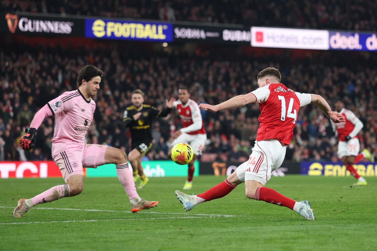 Gyoekeres takes a shot against Lammens.(Image: 2026 Getty Images)