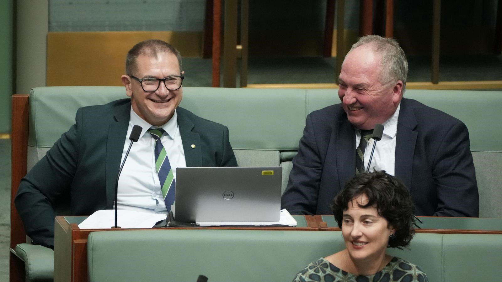Nationals MP Llew O’Brien has quickly snuck over to One Nation MP Barnaby Joyce to have a chat during Question Time.