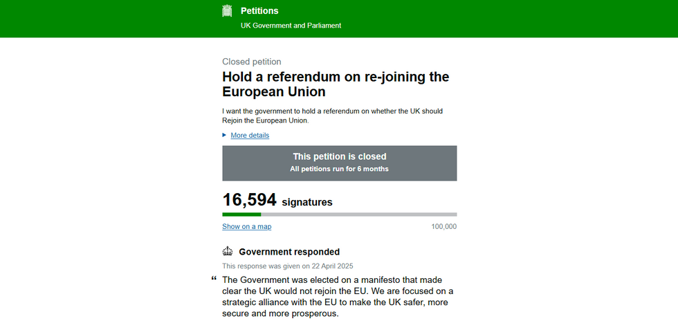 “I want the Government to hold a referendum on whether the UK should rejoin the European Union,” the petition – which opened on April 22 – said.