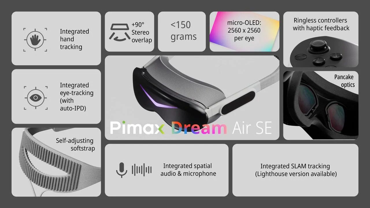 In the meantime, Pimax revealed Dream Air SE, which includes many of the same features of Dream Air, including micro-OLED panels, integrated audio, self-adjusting strap, pancake lenses, hand-tracking, and Tobii eye-tracking. The standout difference though is Dream Air SE’s 2,560 × 2,560 resolution micro-OLEDs and lower price.