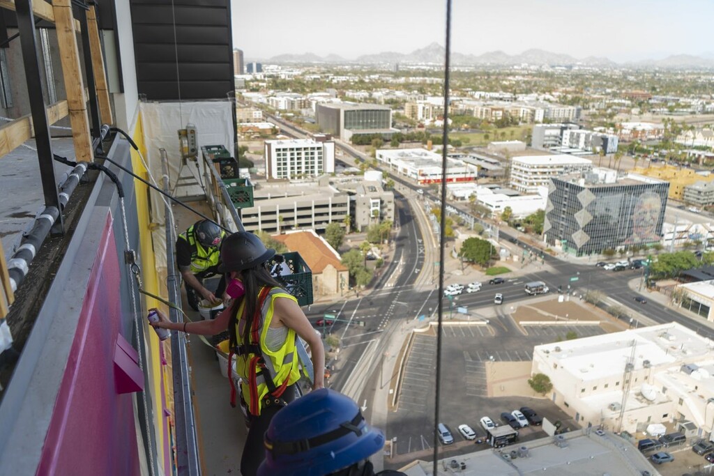 Arizona’s art scene just hit a new high – literally. Artist and creative powerhouse Leila Parnian has completed the state’s tallest mural, a 230-foot-tall masterpiece titled Through Her Eyes, painted on the soon-to-open Saiya apartment building in downtown Phoenix. The monumental mural marks a career milestone for Parnian and sets a new record for public art in AZ.