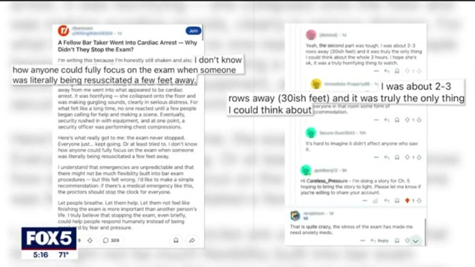 “As soon as the exam ended the proctors collected the exams and the candidates were dismissed from the room so that EMTs could provide the needed medical care to the candidate…. The Board is gathering information, including which candidates may have been impacted by the event, and it will carefully review the information and will formulate an appropriate response in due course.”