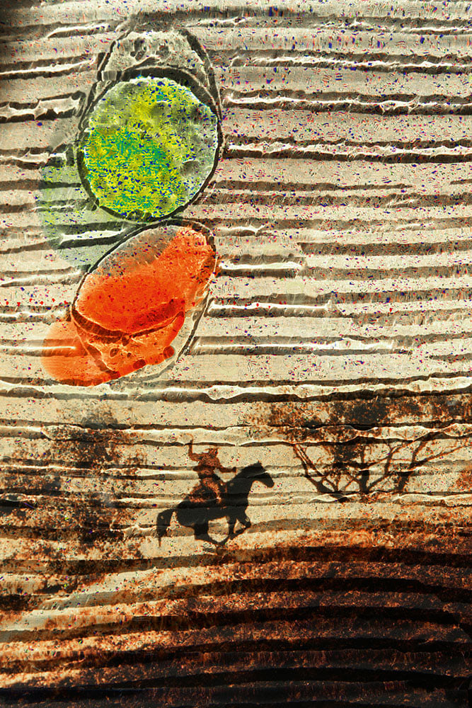 Krantz produces different styles of photos: the book opens with a short series of closely cropped black and white images capturing the movement of a charging bull, horse, and rider. While other images are awash with color—abstract portraits and landscapes reworked with light and a variety of experimental materials from resin to wet paint. The additional layers emphasize the sense of movement and mood, suggesting the sound, heat, and intensity of the scene.