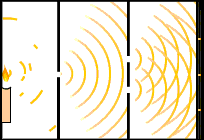 An illustration of the Double Slit Experiment: light from one slit interferes with light from the other, producing an interference pattern (the 3 fringes shown at the right). Credit: Wikimedia Commons.