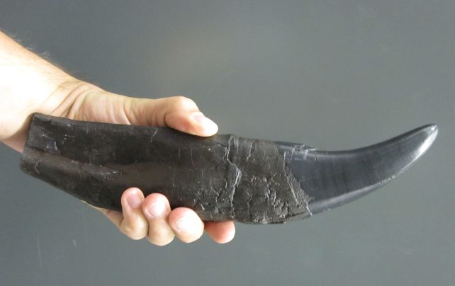 A fossilized T. rex tooth from the Hell Creek formation, now in the Royal Tyrrell Museum in Canada. (Thomas Tütken)