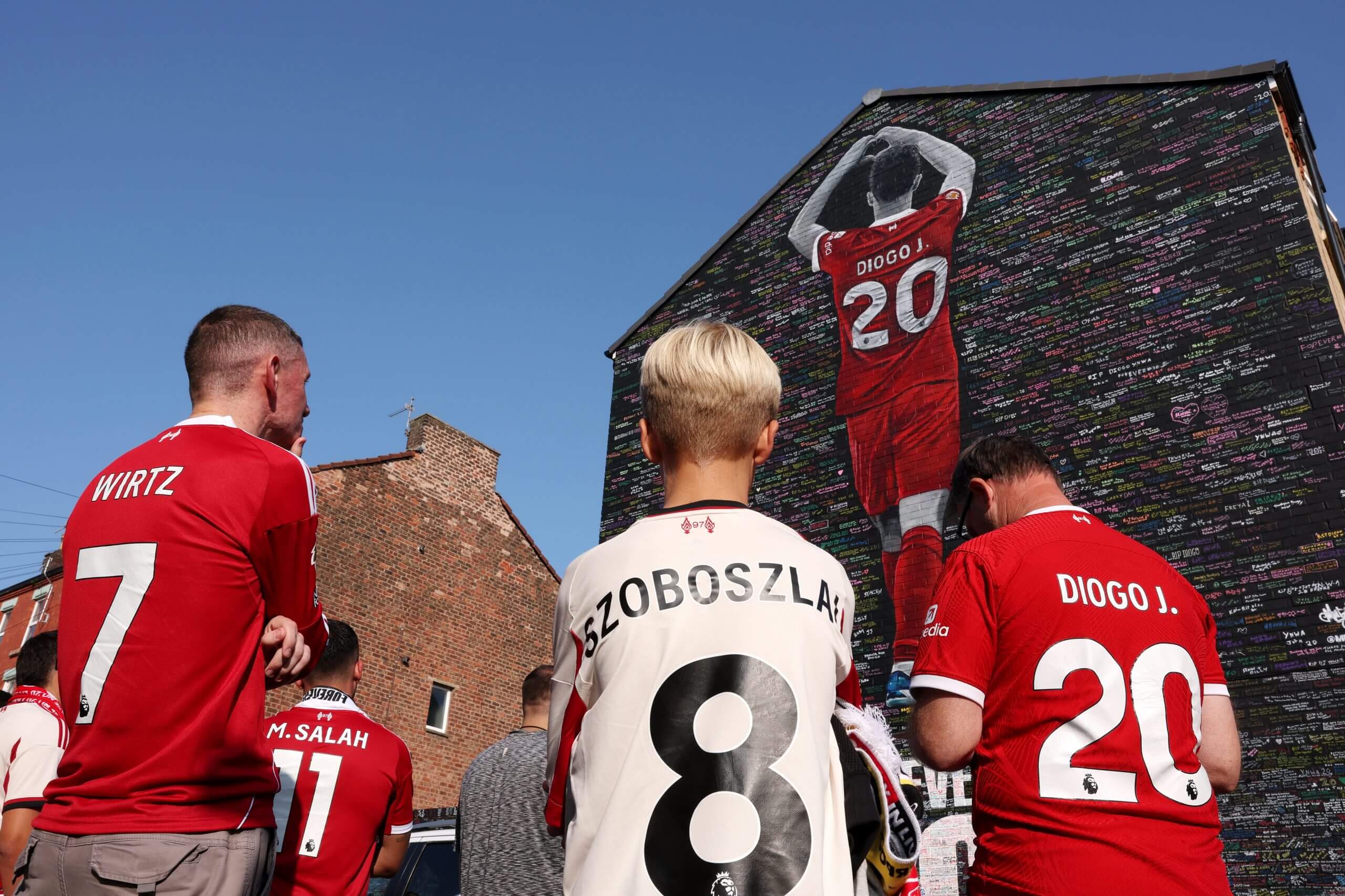 Liverpool fans admire a mural picturing Jota outside Anfield (Michael Steele/Getty Images)