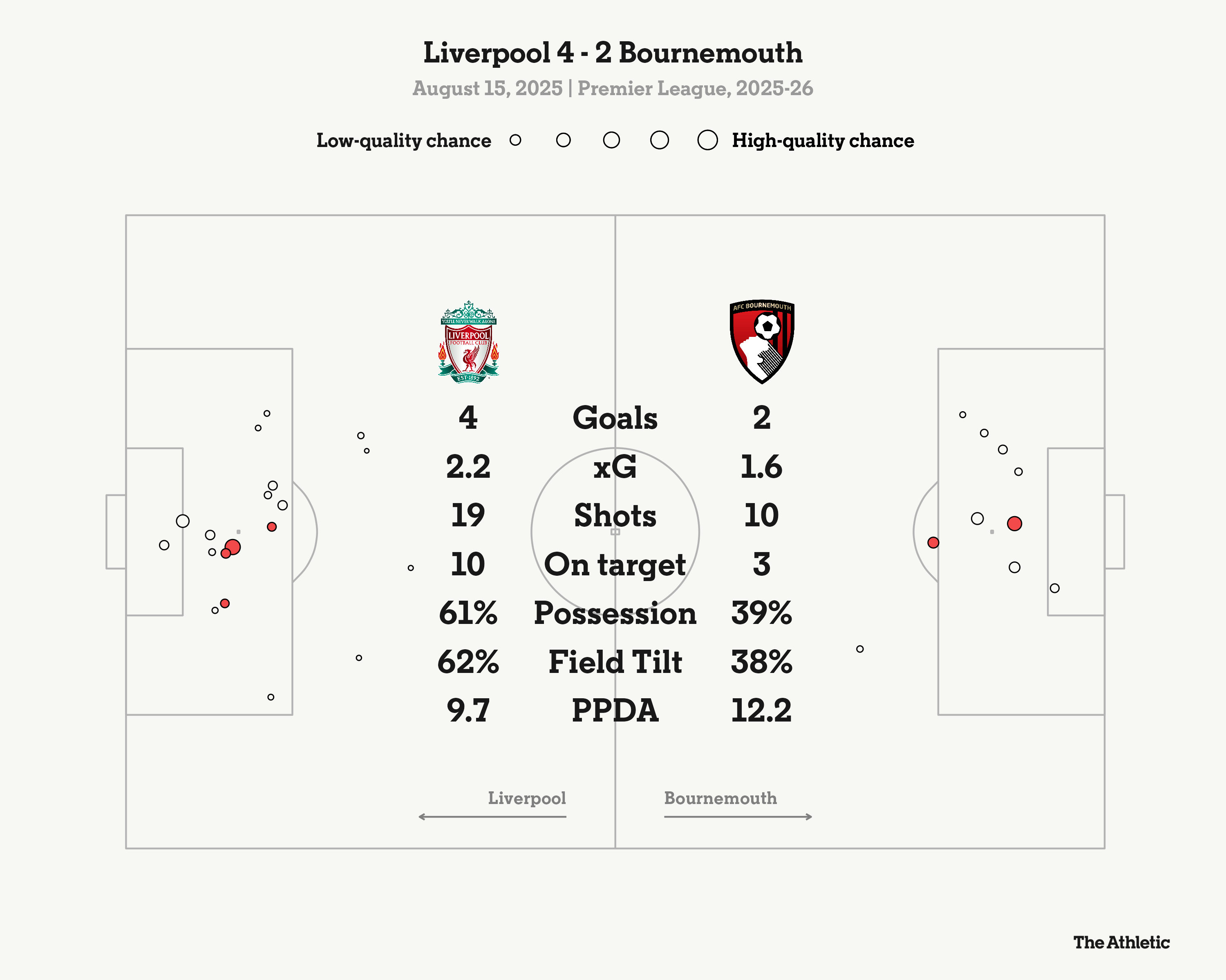 Iraola’s side were difficult opponents, and their counter-attacking threat limited the involvement both full-backs could have in attack. Kerkez was nearly caught out by a cross early on when Semenyo hit a shot over the crossbar, but Liverpool looked more like themselves as a defensive unit when the two new signings were on the pitch.