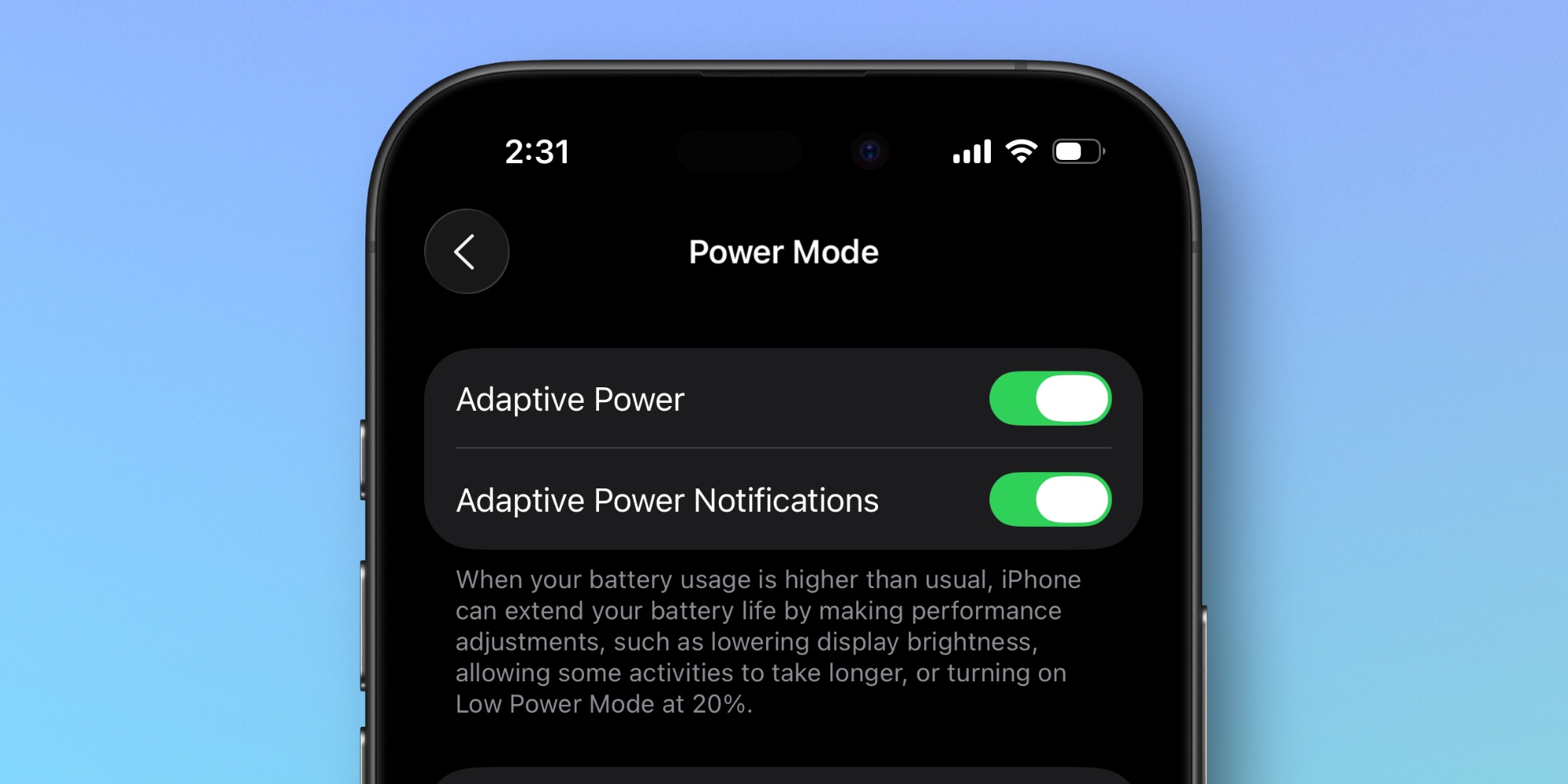 Adaptive Power is a new battery mode coming in iOS 26. It acts as a more moderate alternative to Low Power Mode, impacting performance far less but also bringing fewer battery savings.