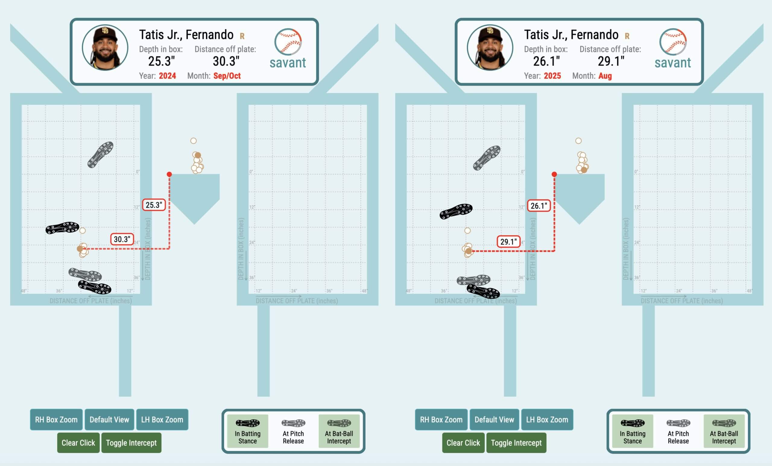The difference between his stance and intercept point late last year (left) and this past month (right) shows just how much more open his stance is now, and how much further he’s letting the ball travel in the zone.