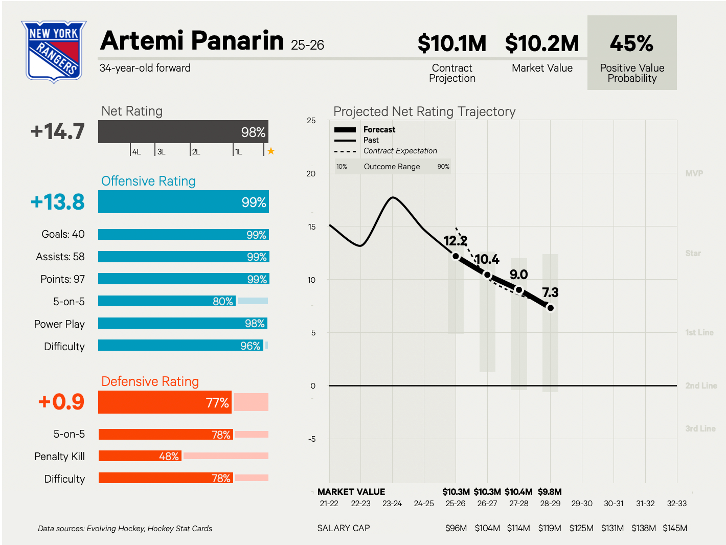 Evolving-Hockey projects Panarin’s next contract to come in at three years with a $10.1 million average salary. That lines up with Panarin’s projected market value for the coming years, according to colleague Dom Luszczyszyn’s model.