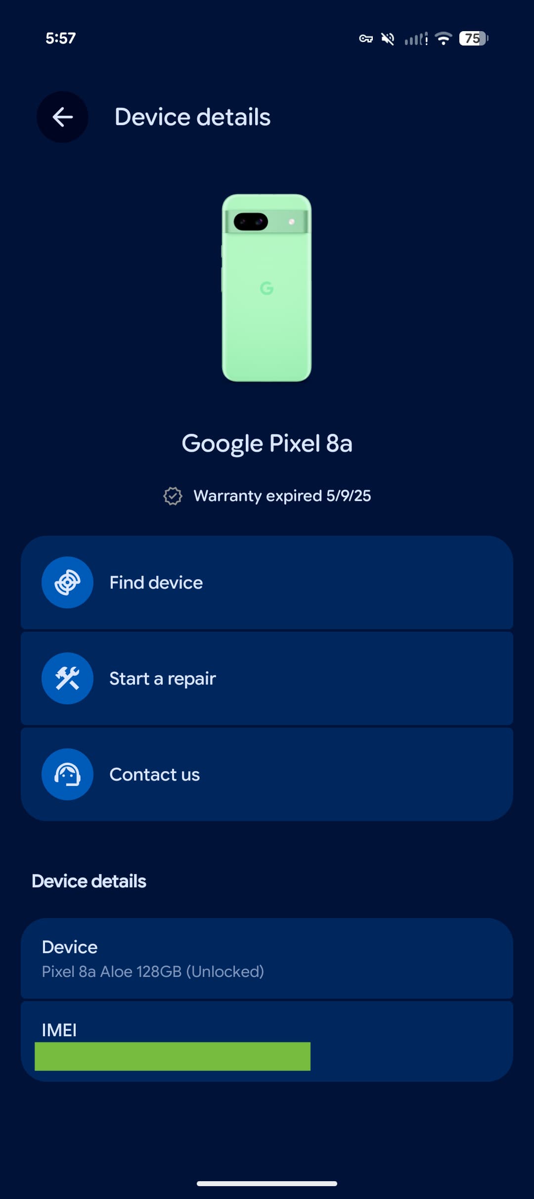 The Support tab shows your devices, including warranty info. Like the Google Store “Devices” page, you can see the IMEI with links to Find device, Start a repair, and Contact.