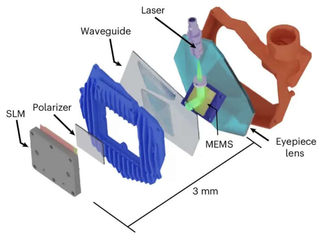 Published in Nature Photonics, their design ditches the flat stereoscopic images used in today’s headsets. Instead, it relies on a custom waveguide, where tiny red, green, and blue lasers are directed by miniature mirrors (MEMS). The light then passes through a spatial light modulator (SLM) before reaching the lens. The result: a system just three millimeters thick.