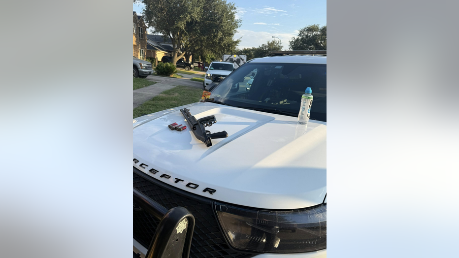 Pictures from the scene show what appears to be a shotgun on the hood of a vehicle.