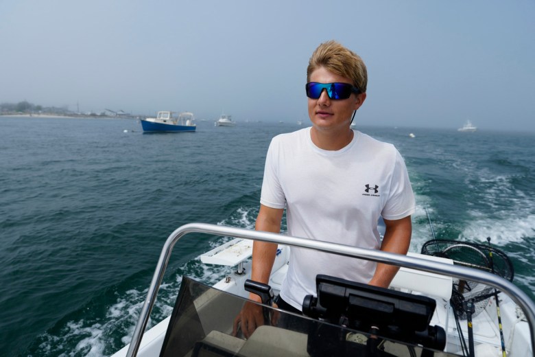 David Lancaster, an avid fisherman who recently captured drone footage off a white shark off of Scarborough, motors out to sea, Wednesday, Aug. 13, 2025, in Scarborough. Credit: Robert F. Bukaty / AP