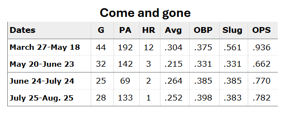 He had 12 home runs in his first 44 games (192 plate appearances) and has half that many in the 85 games (344 plate appearances) since.
