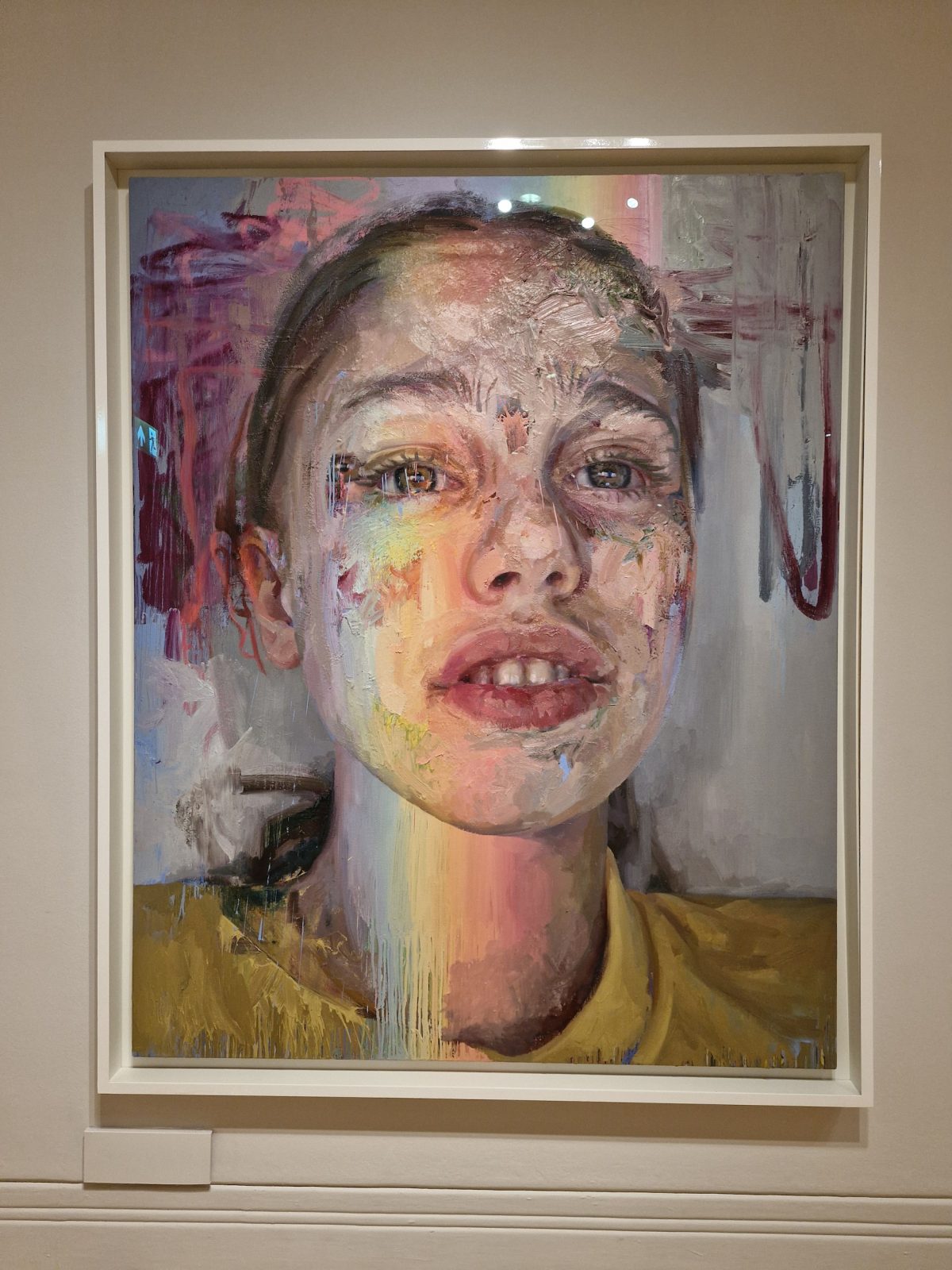Arguably, it is the conventional “portraits” — simply framed faces, rendered on an enormous scale — that are strangely anaemic (notice duplications of the same portrait with varying degrees of effort) and, more recently, louder in tone yet quieter in effect. The final room should be renamed “rainbow filter,” for here the palette is split into the entire spectrum, as rainbows are projected onto the visages, rather like a social media filter. For all the power of her early work, perhaps the oversaturated digital world demands that she dial her painterly tropes to eleven to stay relevant: colors are unnaturally zingy; oil sticks are deployed in vigorous strokes, creating a sense of “angry” brushwork; collages are more disjointed than previous ones. This is where some commentary on the sitters and her relationships with them would come to the (curatorial) rescue and provide some depth: Who are these people, and why does she paint them if not to satisfy an ever-demanding clientele of private collectors?