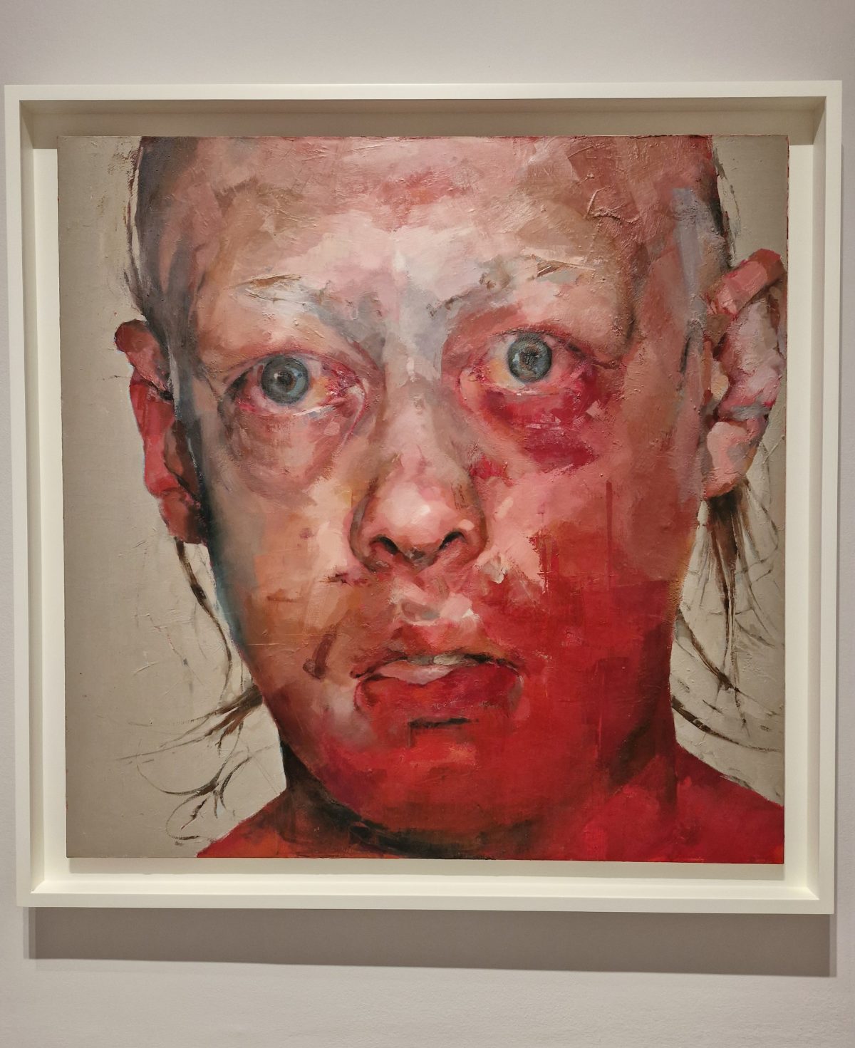 It is hard to overestimate the impact of Saville’s early works on British contemporary painting. Her paintings often disappear into the most discerning private ownership. Those in public collections are the rare anomaly in her current survey, The Anatomy of Painting, at the National Portrait Gallery. As a result, some of that impact is recreated for those viewing her art for the first time. Enormous in scale, her uncomfortably close cropped depictions of women’s faces and nude bodies abound in the joy of painterly modeling, from bare — nude — patches of canvas to her swift, thick, viscous slathers, to dappled dry brush blends. The large scale alone may shock people accustomed to viewing only reproductions on screen. The distribution of muted and contrasting tones is sophisticated. In short, there is a wealth of virtuosic brushwork to drink in.