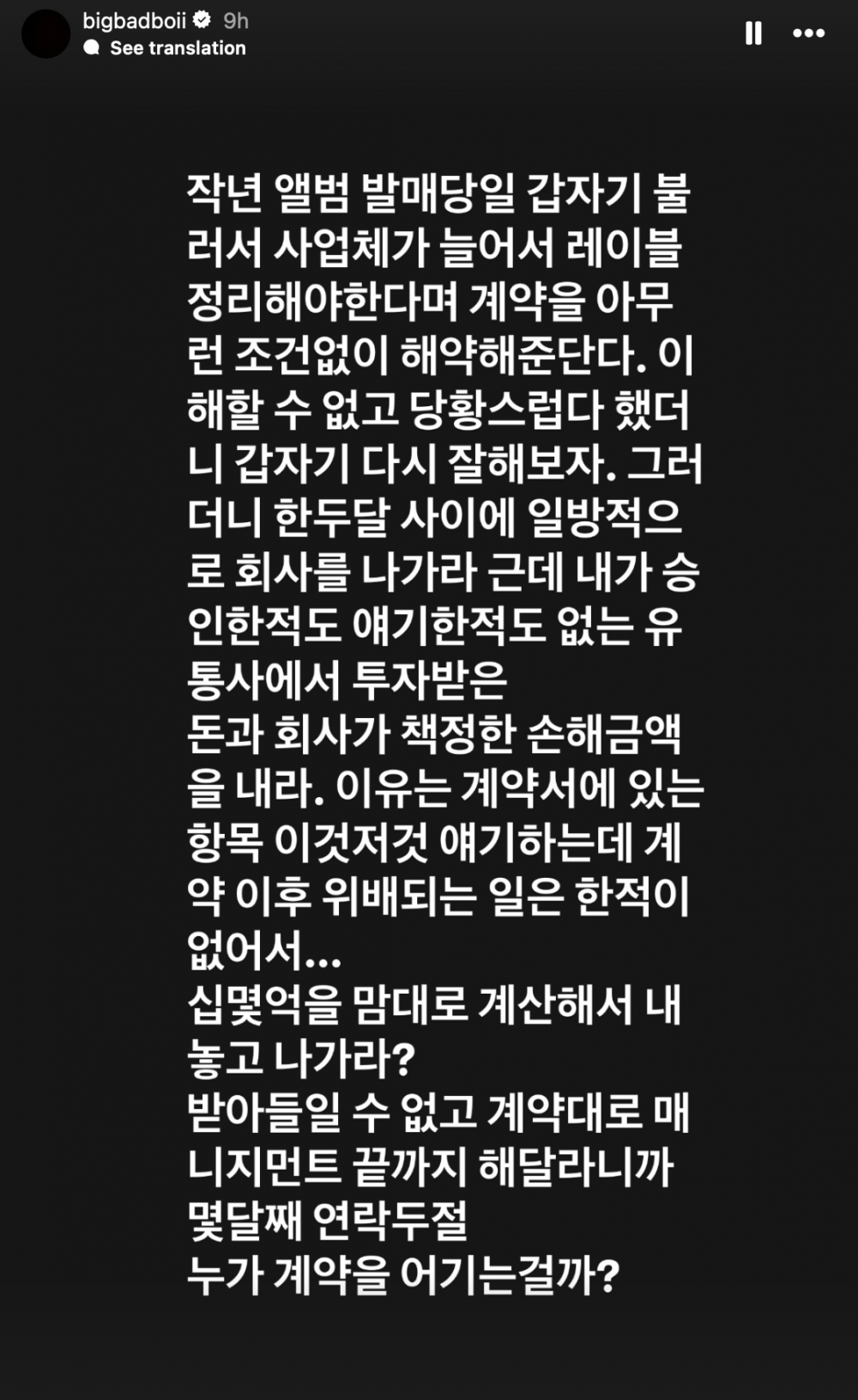 “Last year on the day of the album release, they suddenly called me and said that they would end my contract without any strings attached because they had to close the label. I didn’t understand and said that I was confused, and then they took their words back and just said, let’s do our best. Within 1~2 months, I get a notice asking me to leave the company and pay damages for an investment from a distributor I’d never even heard of or agreed upon. Apparently there are a bunch of reasons according to the contract but I don’t recall doing anything that went against the contract since I signed it…