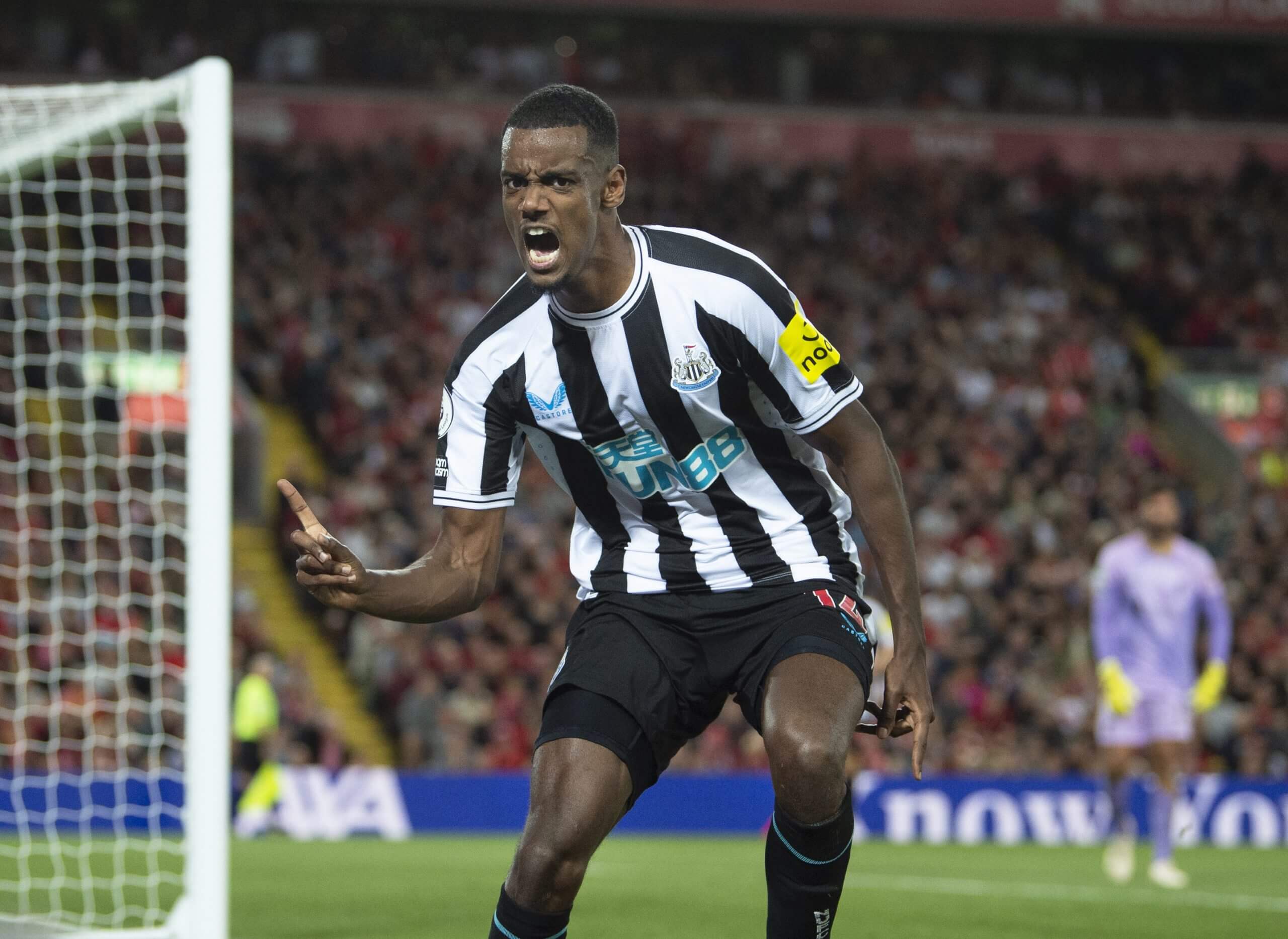 Isak celebrates scoring on his Premier League debut at Anfield (Photo by Visionhaus/Getty Images)