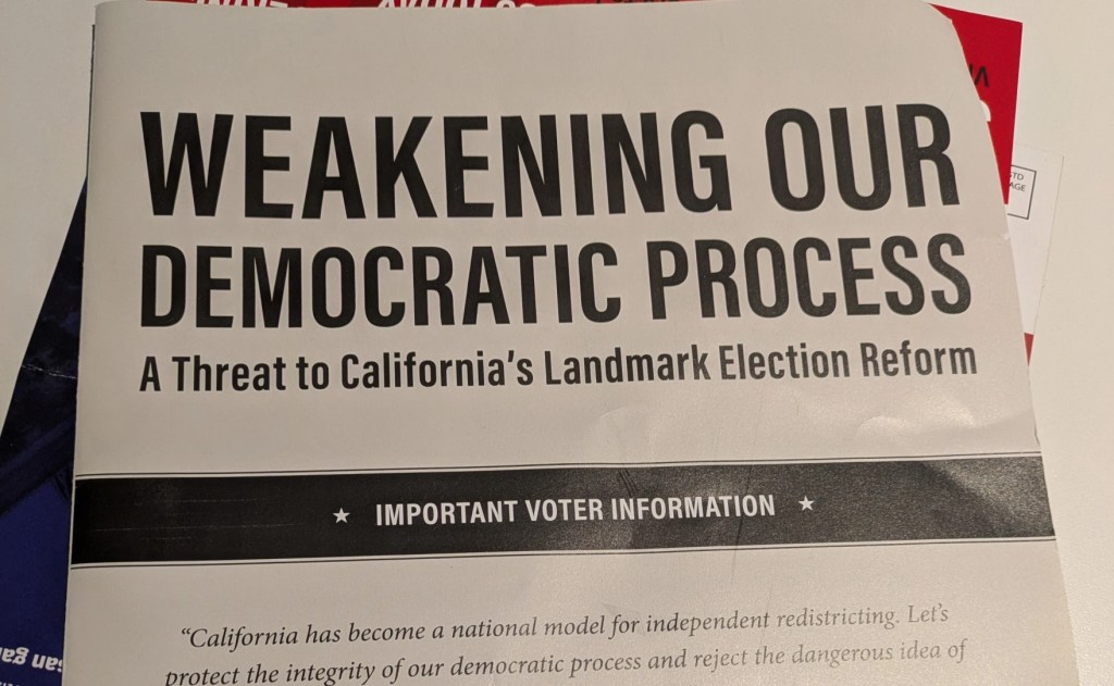 An election mailer opposing California’s redistricting ballot measure is shown in this photo taken Sept. 3, 2025. / Claire Trageser for KPBS