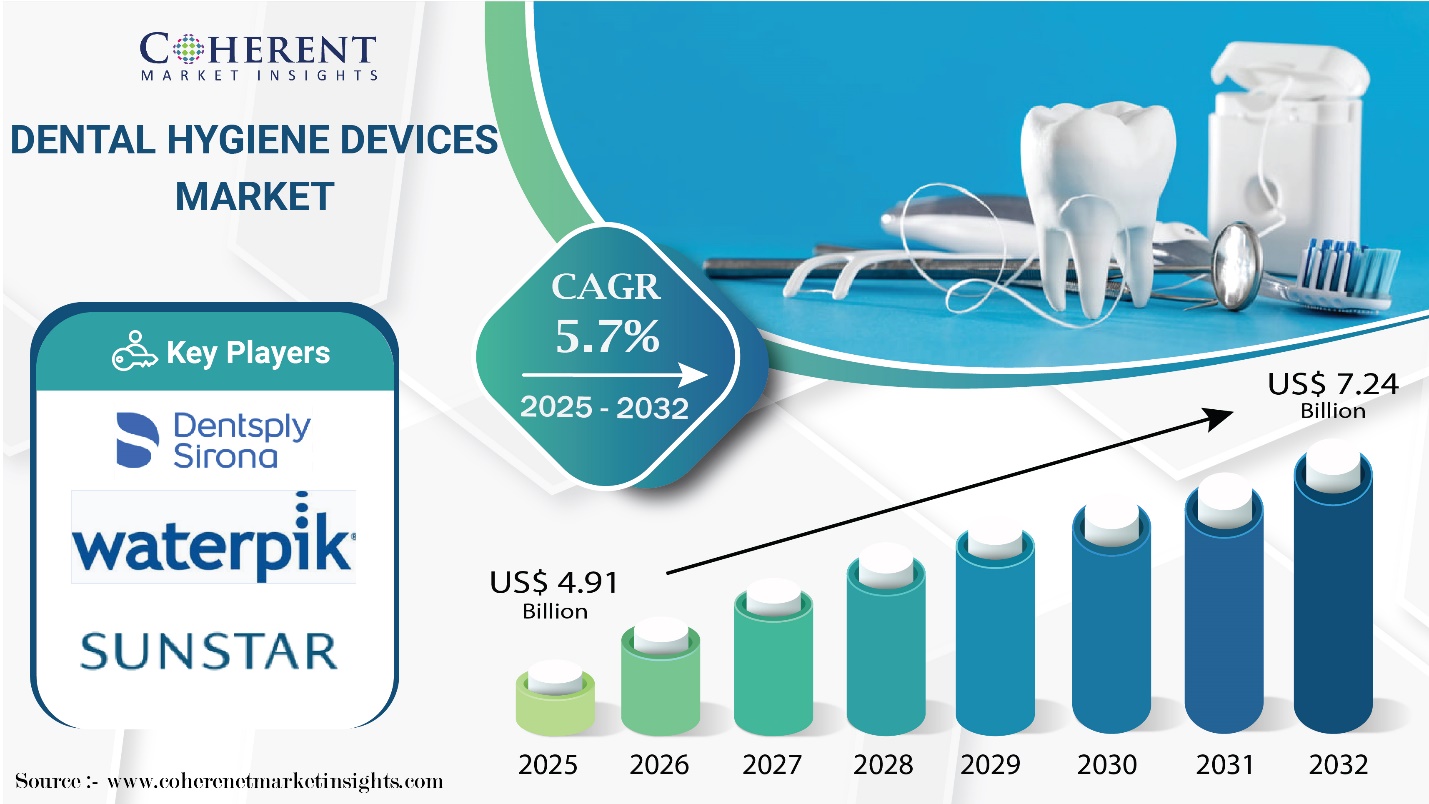 According to Coherent Market Insights (CMI), the global dental hygiene devices market size is expected to grow steadily, increasing from USD 4.91 billion in 2025 to USD 7.24 billion by 2032.