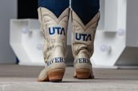 Cheerleaders performed before Mr. and Ms. UTA took the stage. President Jennifer Cowley wore limited edition 130th anniversary white cowboy boots as she gave her speech.