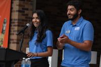 Ms. UTA, Sraavya Maulika Yenugapalli, left, and Mr. UTA, Harshdeep Singh, address the crowd during the 130th Birthday Bash on Sept. 5 at Brazos Park. Yenugapalli and Singh were elected as co-presidents of the UTA Ambassadors last April.