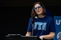 UTA President Jennifer Cowley speaks to the crowd during the 130th Birthday Bash on Sept. 5 at Brazos Park. Cowley wished UTA a happy birthday and acknowledged the milestones that led to where the campus is now.