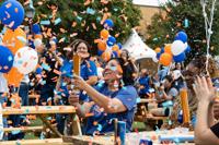 Public health sophomore Martin Camarillo helped set off the confetti cannons after the birthday song. Orange and blue confetti paper rained down around delighted attendees.